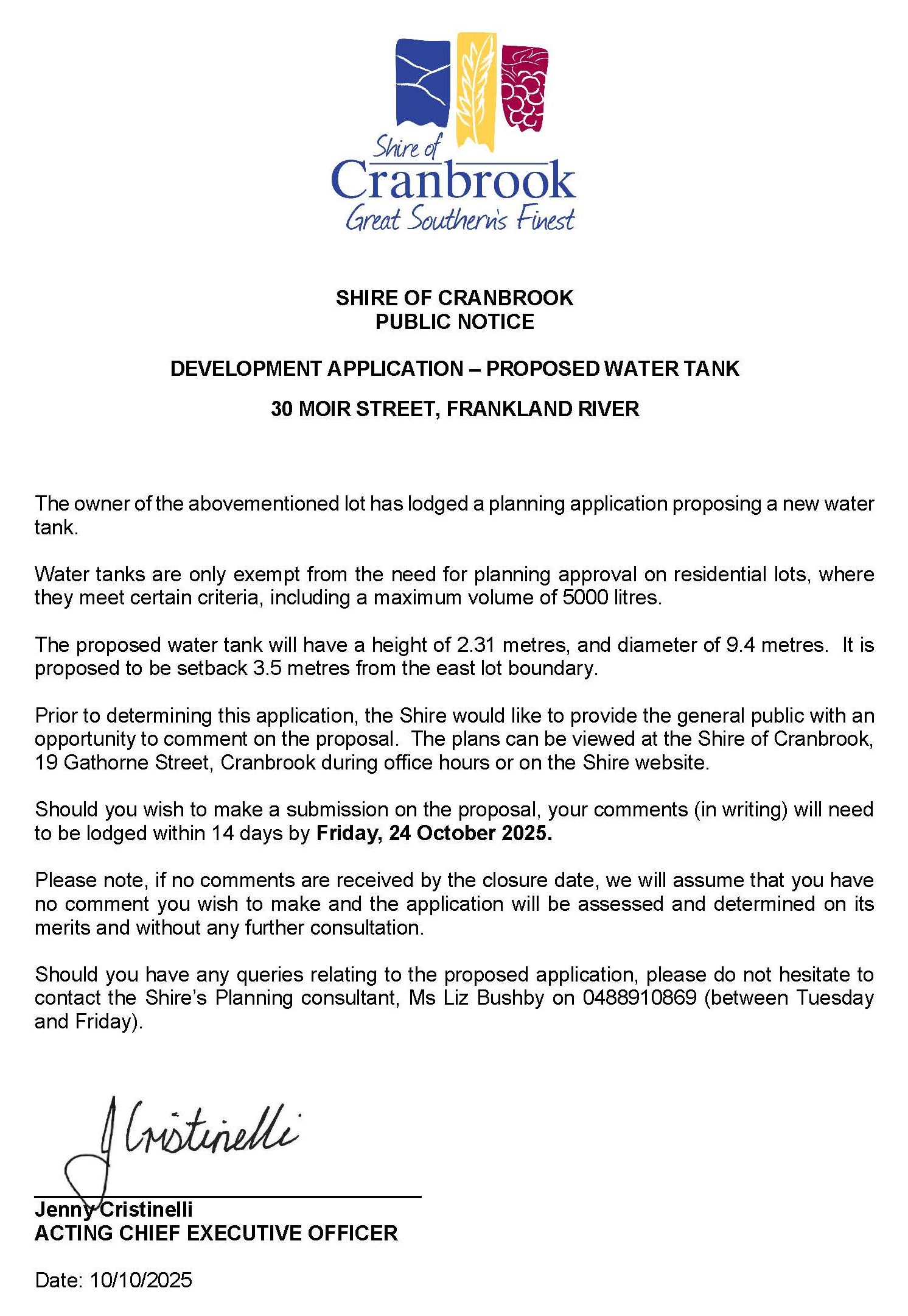 An application for development for a water tank has been received or the below mentioned lot. To view the site plans, click the link Site Plans .