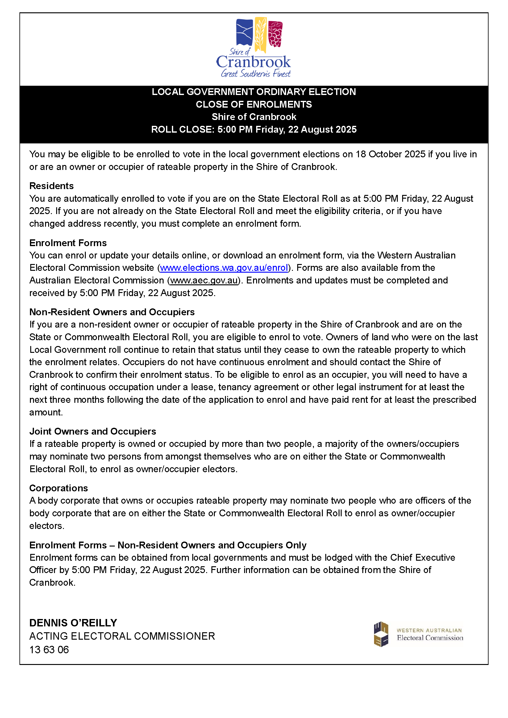 If you are enrolled on the State electoral roll with a Shire of Cranbrook address you will automatically be on the Shire of Cranbrook residents roll. If you own land in the Shire of Cranbrook but live outside the Shire, you may enroll to vote in the Shire of Cranbrook election using the prescribed Form 2 if you are an individual or Form 2A if you are the nominated person of a body corporate.